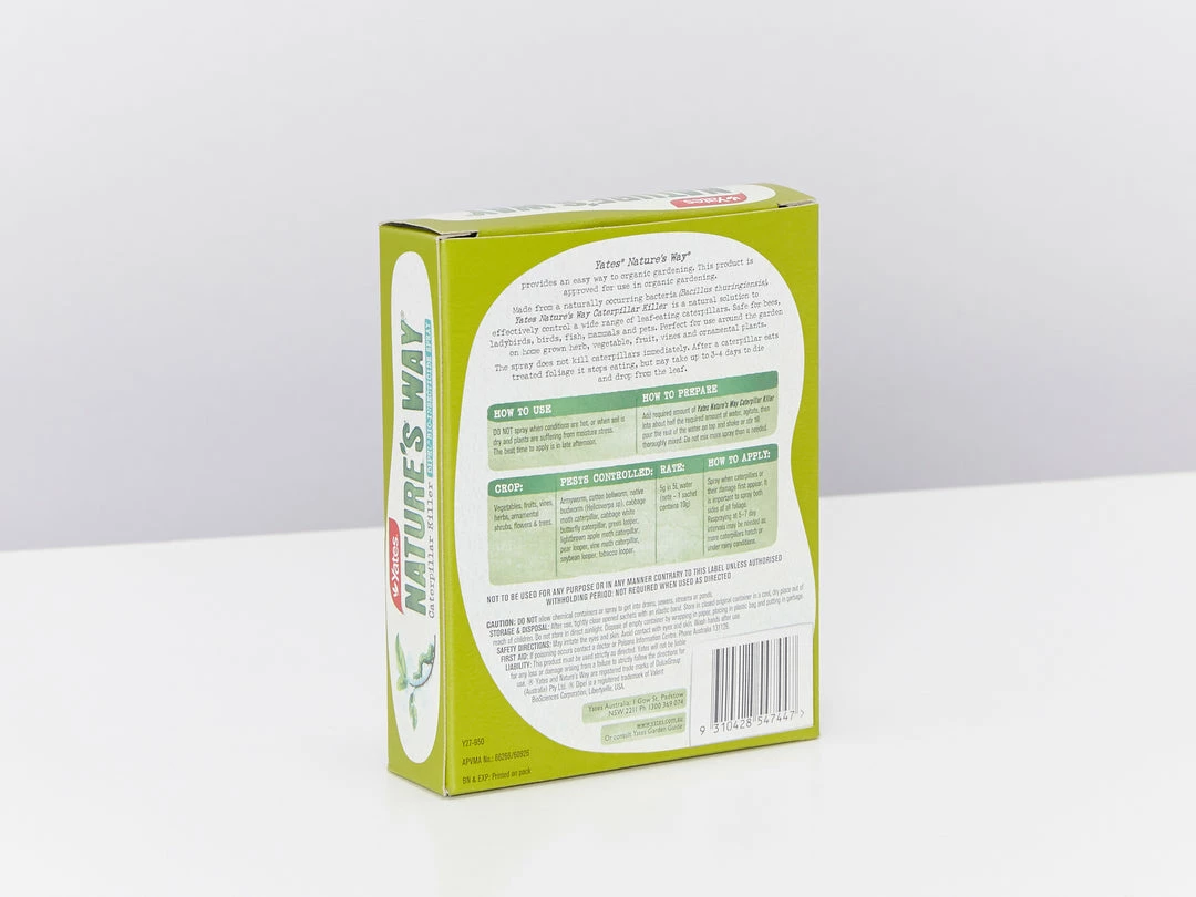 Made from a naturally occurring bacteria (bacillus thuringiensis) Yates Natures Way Caterpillar killer is a natural solution to effectively control a wide range of leaf-eating caterpillars. Safe for bees, ladybirds, birds, fish, mammals, and pets. Perfect for use around the garden on the homegrown herb, vegetables, fruit, vines, and ornamental plants.
