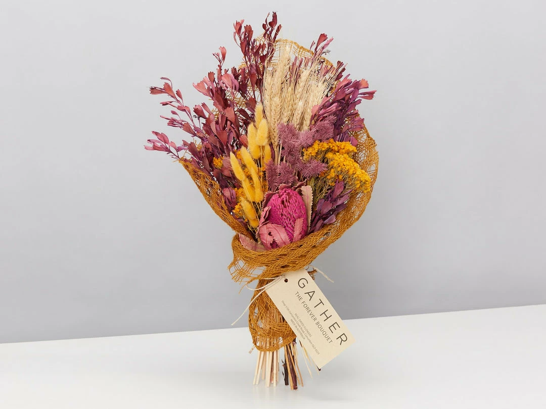 Dried flower posy (that’s florist speak for small bouquet), fully arranged and wrapped, ready to be gifted and to delight your recipient.