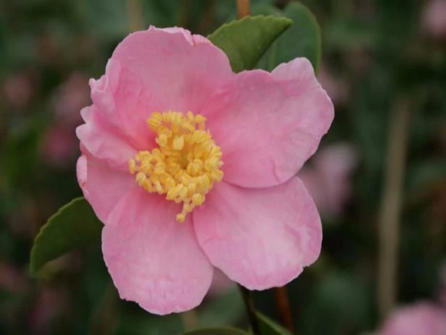 Camellia sasanqua ‘Marie Young’ produces sweet and dainty large, clear pink, cupped-form, single flowers in Autumn and early Winter. The petals are indented on the outer edge and the golden yellow stamens are showy. A tall, dense evergreen shrub with small, bright green leaves and a strong, slender, upright growth habit.
