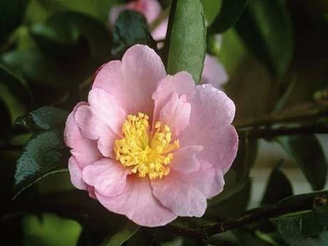 Camellia sasanqua ‘Plantation Pink’ produces an abundance of showy pale to mid-pink, semi-double blooms with prominent stamens. Flowering is from Early Autumn through to mid Winter. A strong, dense, faster growing variety with bright green foliage.