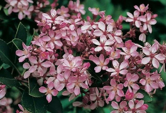 This lovely shrub has dark-green leathery and glossy leaves that shine after rainfall, and rather large star-shaped pink flowers that take you by surprise in Spring. The flowers are deliciously scented and worshipped by pollinators.