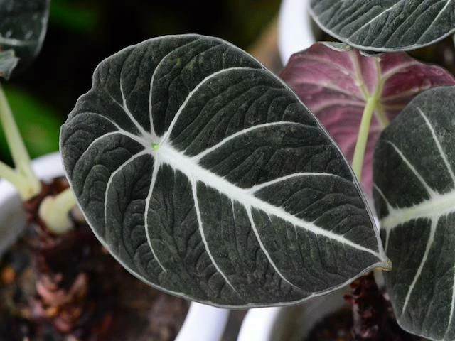 My features: Dark, almost black leaves, adorned with brilliant silvery-white veins and velvety look makes for a strikingly beautiful plant. The underneath colour throws off a purple tone. Anthurium-like flowers.