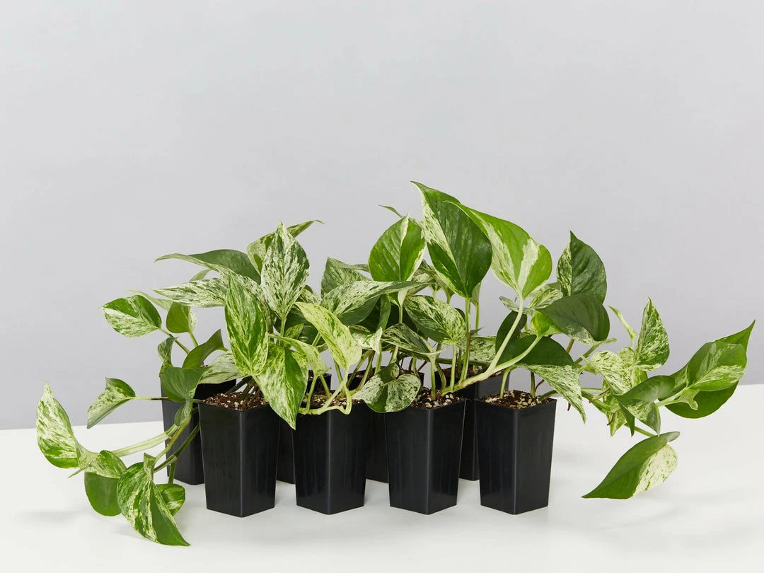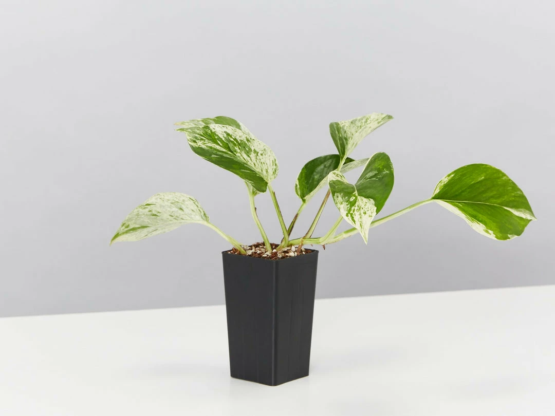 She’s a Queeny, yes indeed. The Epipremnum aureum – Pothos “Marble Queen” displays creamy white foliage, flecked or mottled with green, a great little trailing houseplant fit for that of a queen. She requires more light than other Pothos, or she may revert to all green on you.