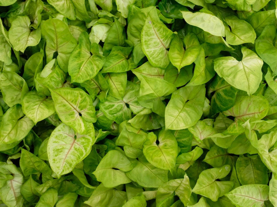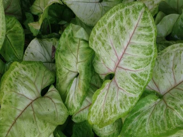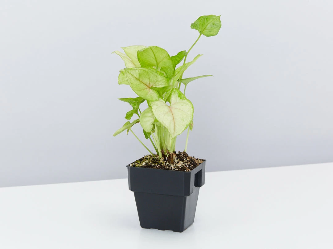 Syngonium Golden Illusion is a real showoff in our greenhouse. She is deal for those container gardens, terrariums and as a houseplant and office plant. Syngonium is one of the most popular houseplants due to their attractive foliage and ease of care. It prefers evenly, almost constantly moist soil, but needs drainage and will not do well in a soggy environment. Due to its more cascading / trailing nature, as they age, it is a great candidate for a hanging basket. The golden illusion has golden arrowhead shade leaves with burnt rose veins.