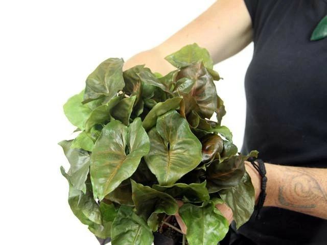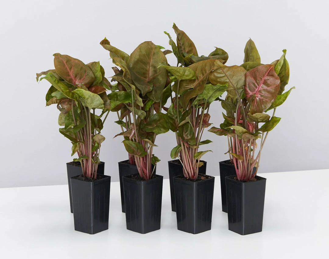 Syngonium podophyllum Bronze Maria is a natural evergreen beauty that shows off her traditionally arrow-shaped glossy leaves with bronze tones and red veins. She’s just a pleasure to own, especially when the new growth pushes through in baby pink.