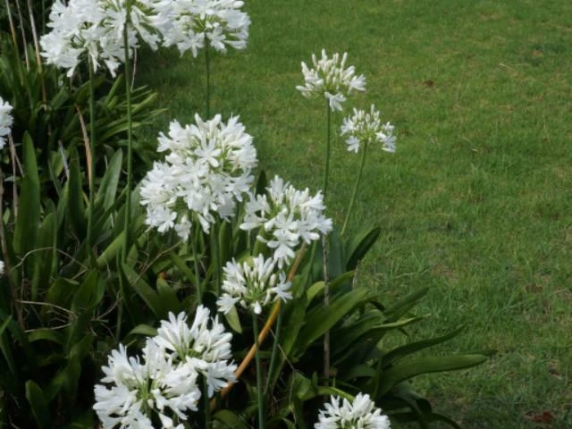 Agapanthus orientalis – white, or White Agapanthus, is a clumping plant with strappy green leaves. The large head of pure white flowers are arranged at the end of a tall stem and make a flamboyant statement during Summer. Agapanthus are tough plants well-suited to Australian conditions, needing little water once established.Â