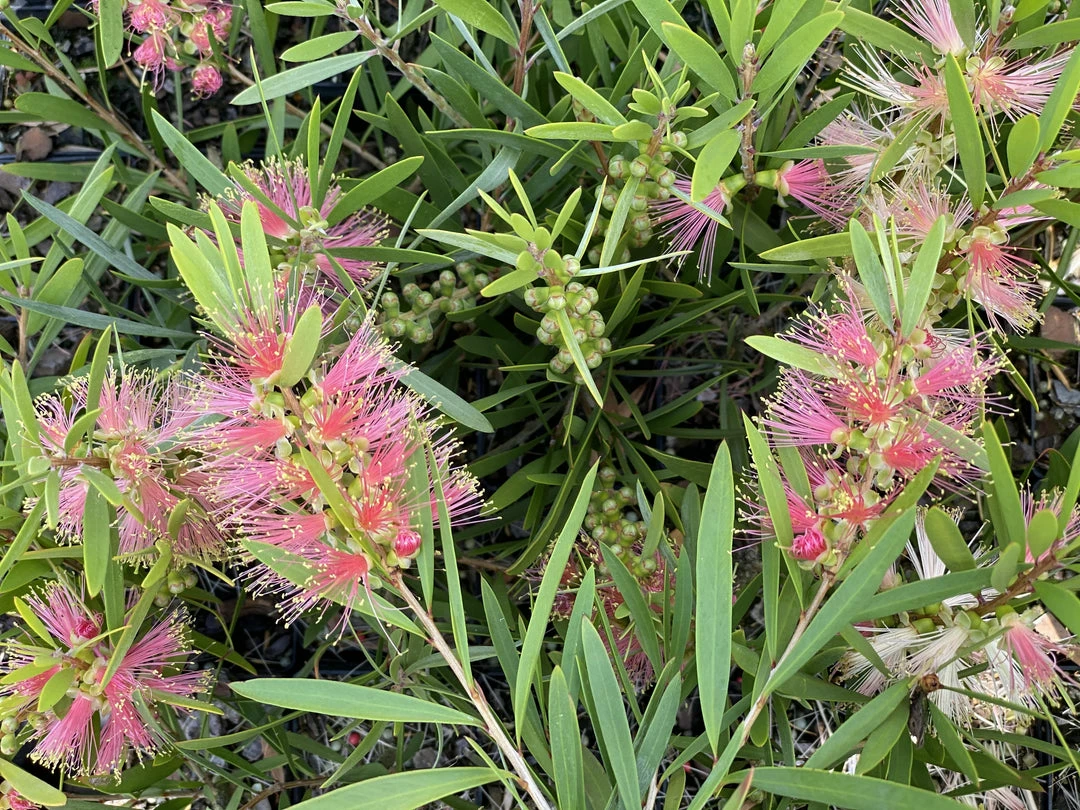 Callistemon citrinus ‘Pink Champagne’ is a larger Callistemon shrub with pink bottlebrush flowers and yellow pollen in spring and autumn. The flowers will fade to white as they age, and are complemented perfectly by grey-green foliage.