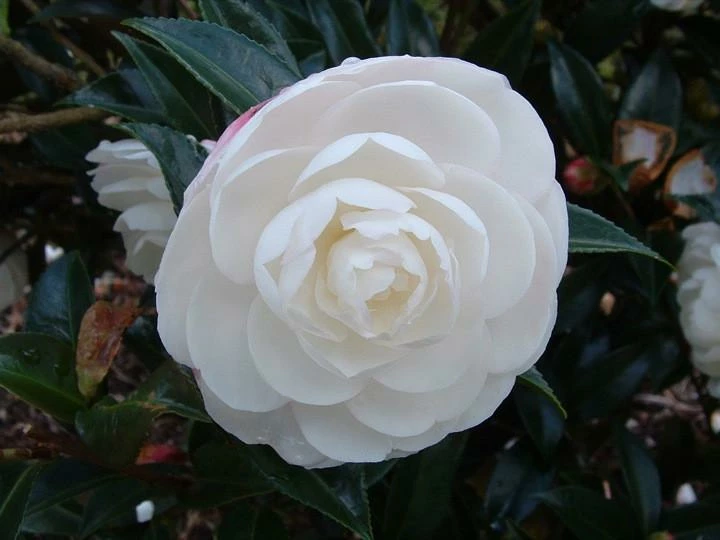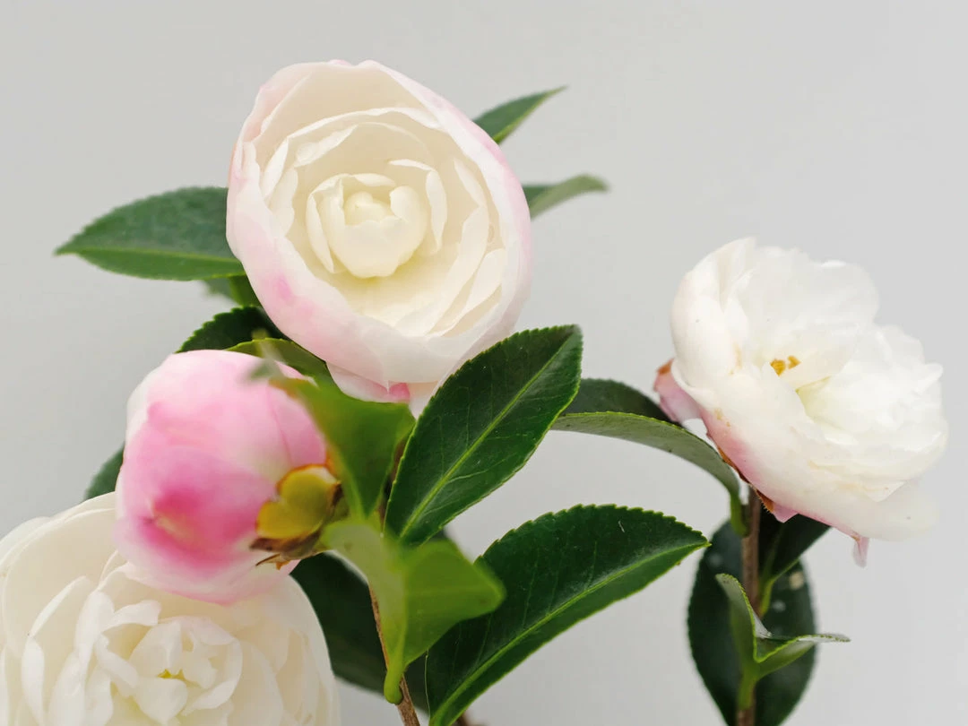 Camellia sasanqua ‘Early Pearly’ has large, formal double, pearly white blooms with outer rows of blush-pink petals. The stamens are exposed as each flower ages. The abundant showy flowers are produced during Autumn through to mid Winter. I have an upright habit with lateral growth that tends to be pendulous which makes me ideal for a smaller screening plant or espalier. It is also perfect as a tub specimen.