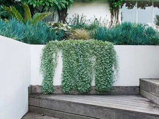 I am the only live plant you will need if you’re thinking “god I need to cover that ugly retaining wall.” He is easy to grow, can handle frost, has minimal water once established and does well by the beach. Dichondra Silver Falls can flaunt amazing grey/silver fan-shaped leaves basically – looks great cascading.
