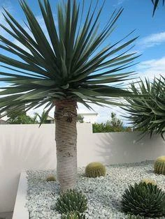 This is a slow-growing, sub-tropical tree-like plant with a single scaly stem and blue-green spiky foliage. After 10-15 years he’ll produce a single flower spike with coral berries and start branching out to eventually form an umbrella-like habit.