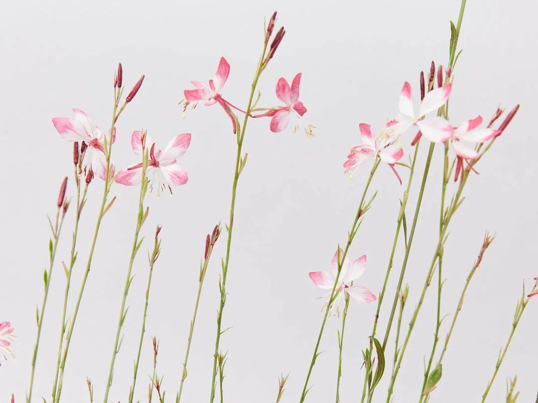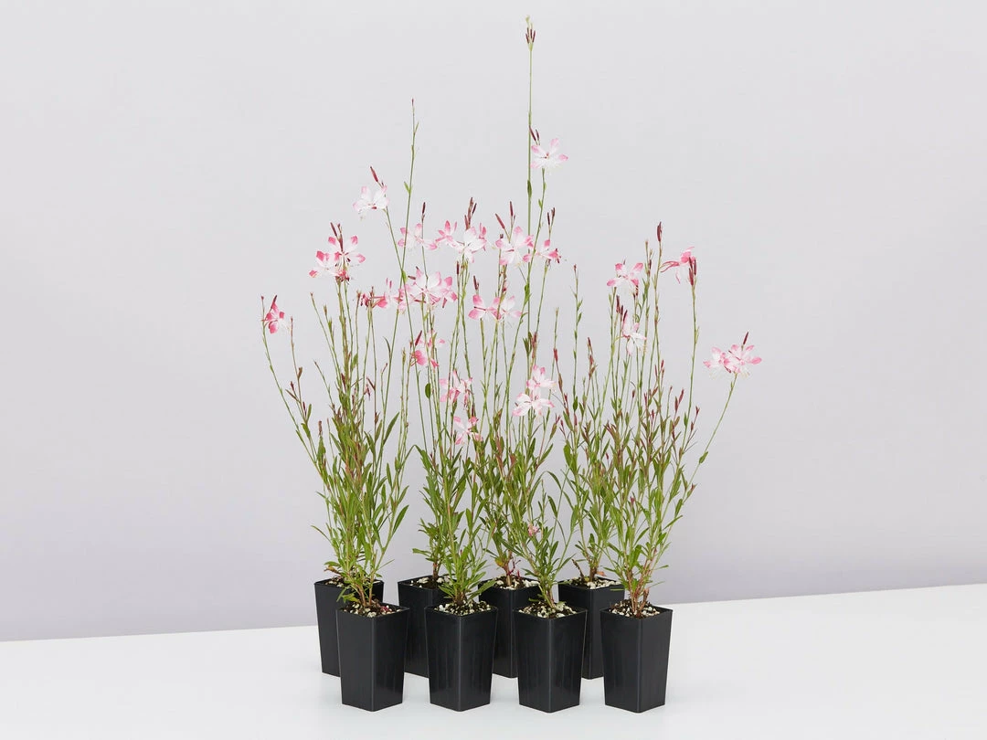 Oenothera (Gaura) lindheimeri Belleza Compact Light Pink is a must in any cottage garden bed, her pretty soft green foliage acts as a backdrop for the cute little light pink flowers that sit high on slender arching stems. From afar the flowers look like prancing butterflies. Mass plant her as a border plant or for an elegant outdoor pot plant.