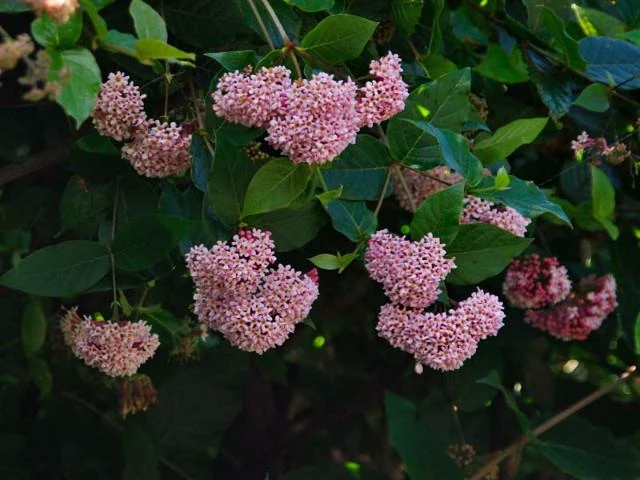 Rondeletia amoena is a tall, dense and hardy evergreen shrub just perfect for a hedge or screen. Large, broad leaves that are glossy, heavily veined and coloured mid-green fill your garden all year round, and then in springtime, the magic happens.