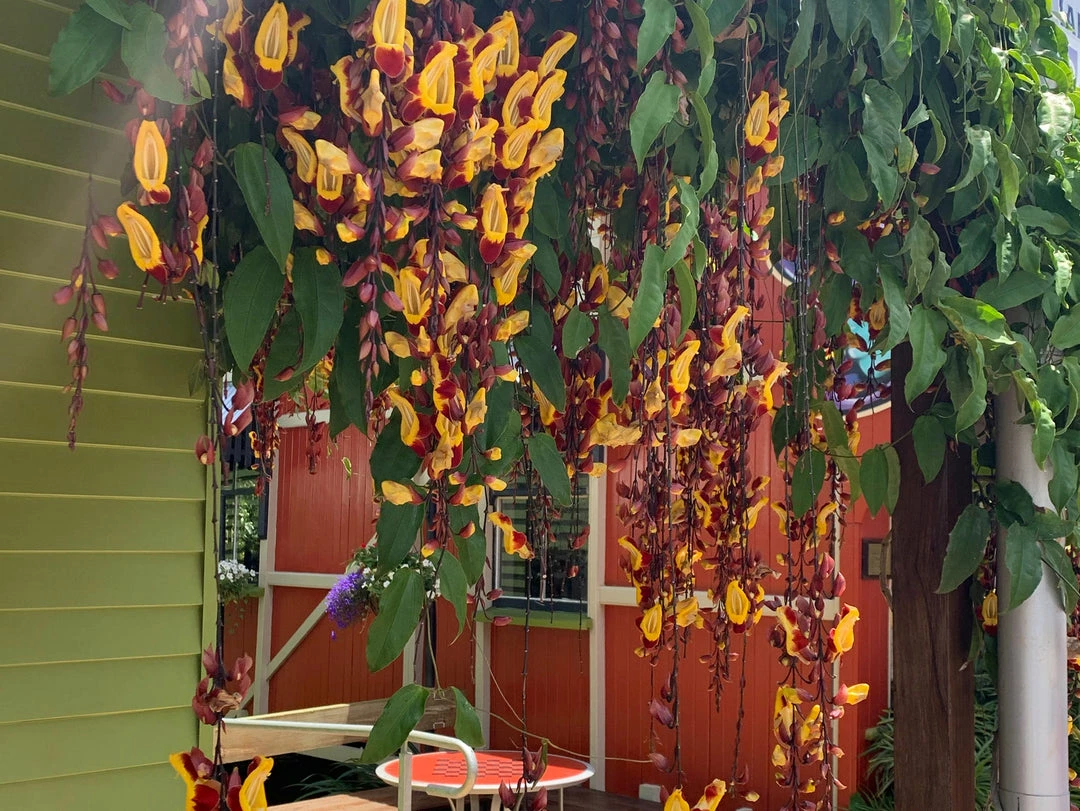 Thunbergia mysorensis is a fast growing climber known for her big yellow slipper shaped flowers that hang down like bells. Also known as the Lady Slipper Vine this beautiful vine has glossy green leaves and looks amazing just about anywhere in the garden. Originally from India this tropical vine is hardy, low maintenance and adaptable, it can handle light frosts but prefers a warm, tropical climate.