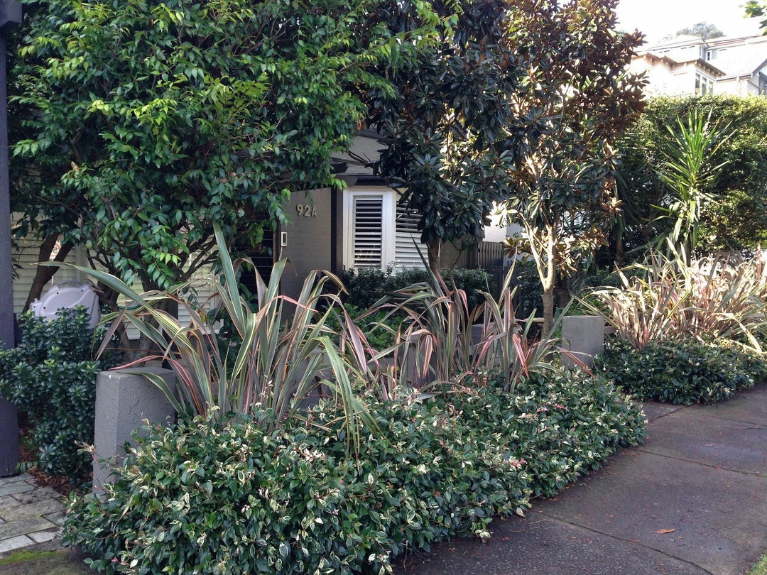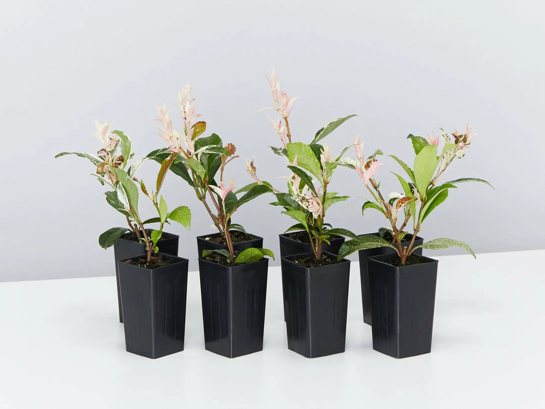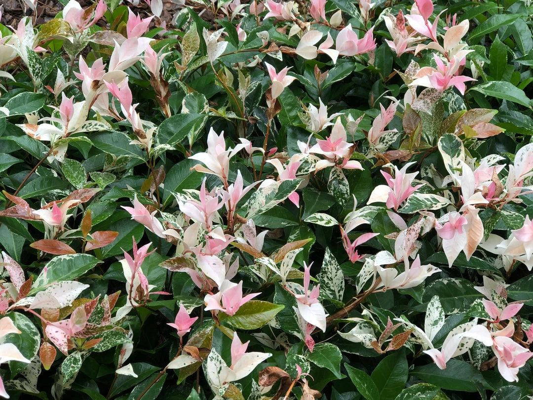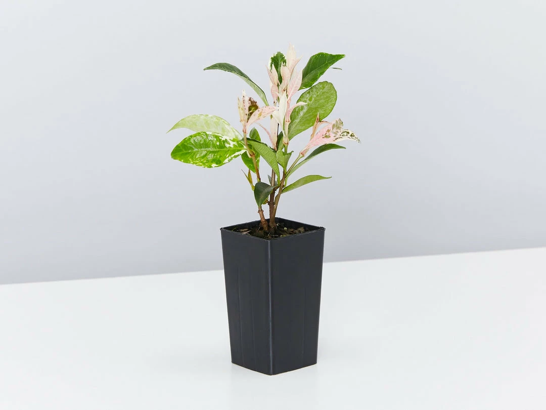 Trachelospermum jasminoides variegated “Star Jasmine”, also known as Jasmine tricolour. This plant has a beautiful mixture of leaf colours ranging from green to pink and white. You can hedge it, cover a wall with it, use as a ground cover, let it ramble down an embankment. Super versatile, is hardy, has a beautiful scented white star-like flowers. What more could you want?