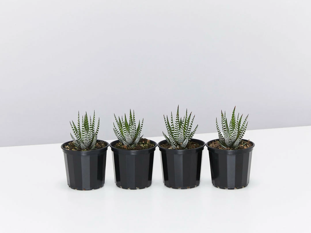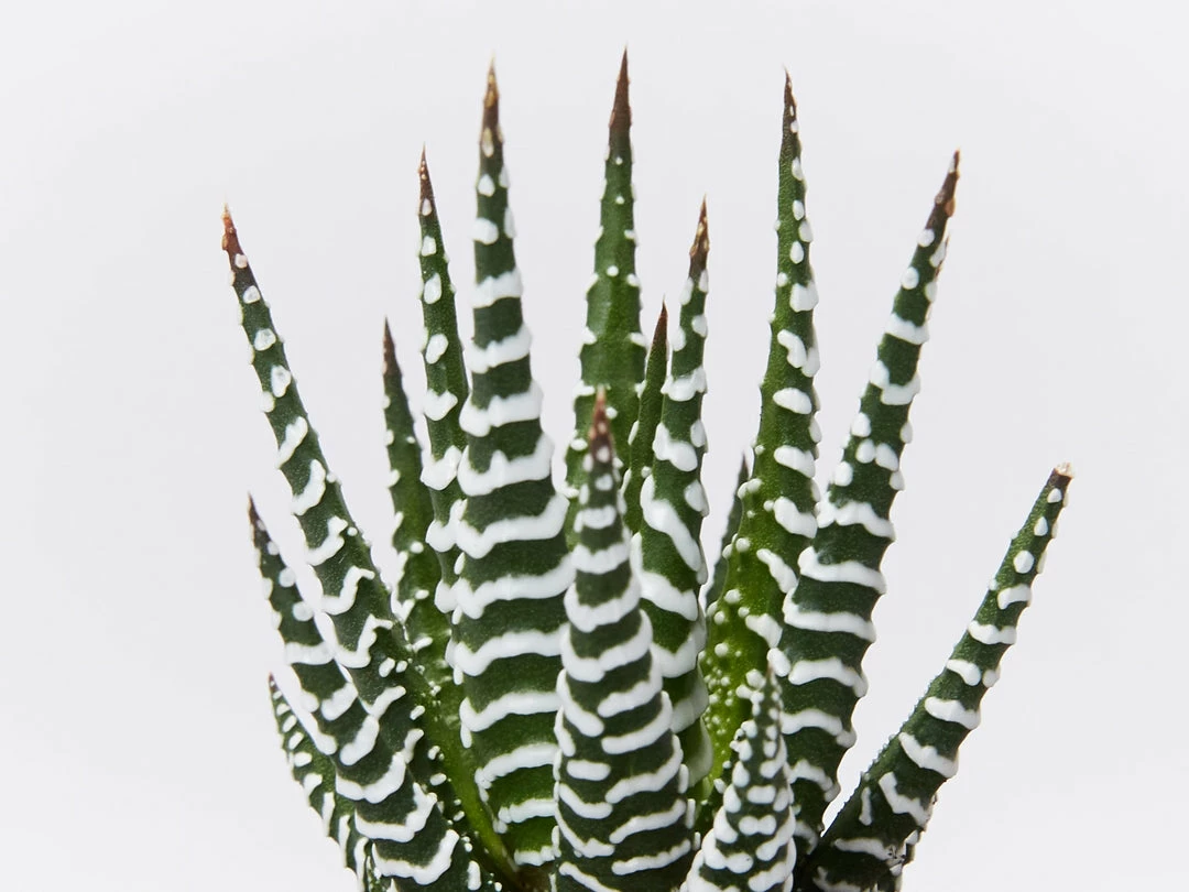 Haworthia fasciata Wide Band is an upright succulent with dark green spike shaped leaves that form in a tight rosette. The star of this succulent is the patterns – raised white dots and stripes appearing on each leave that stand out against the dark green.
