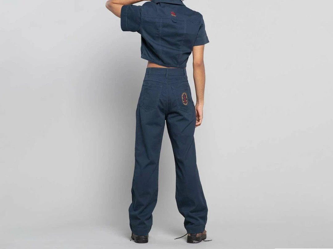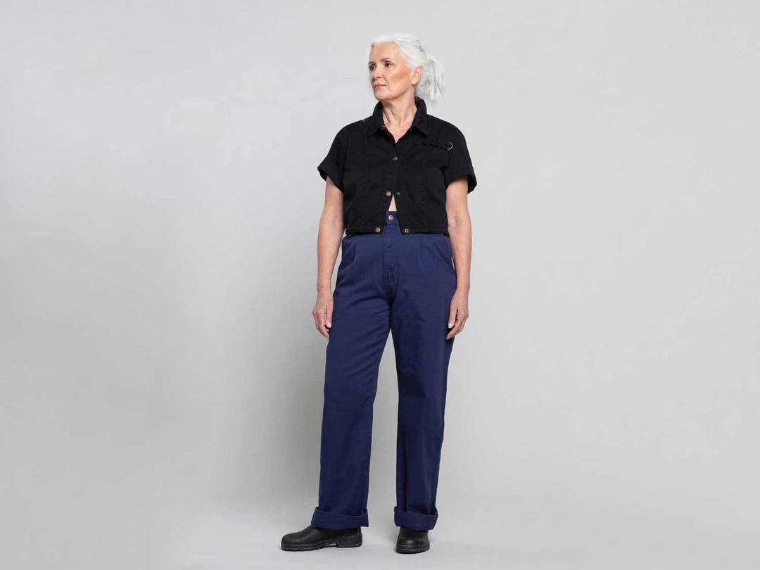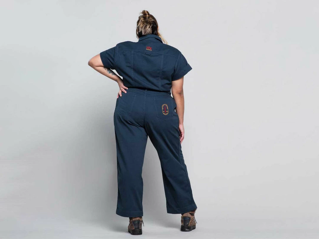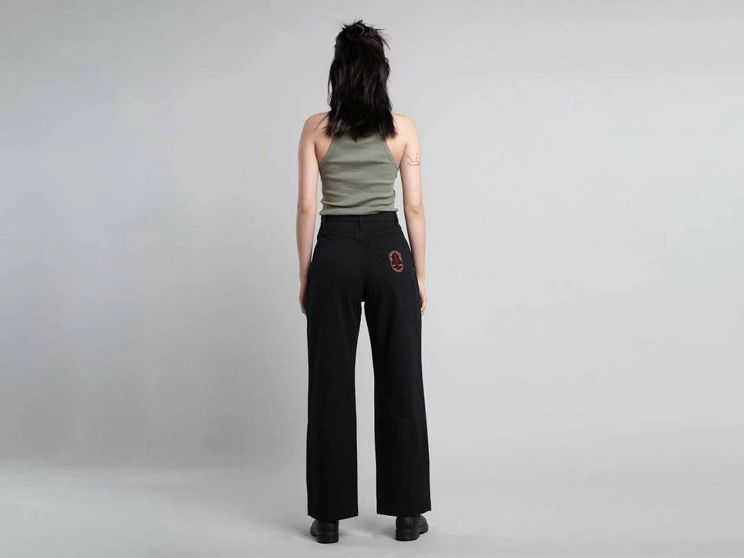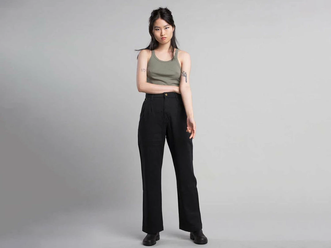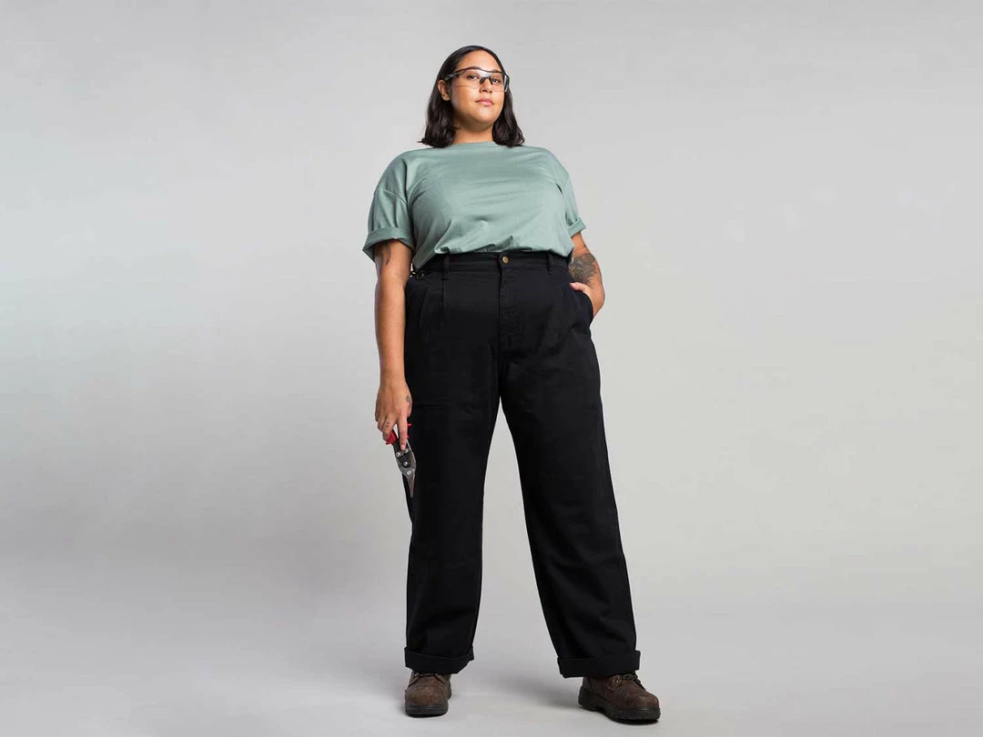 A stylish pant that works perfectly on or off the job. Fitted at the waist, with a relaxed leg-line tapering slightly at the hem. D-ring brass detail for keys and pocket rivets for reinforced support. 100% cotton fabric.