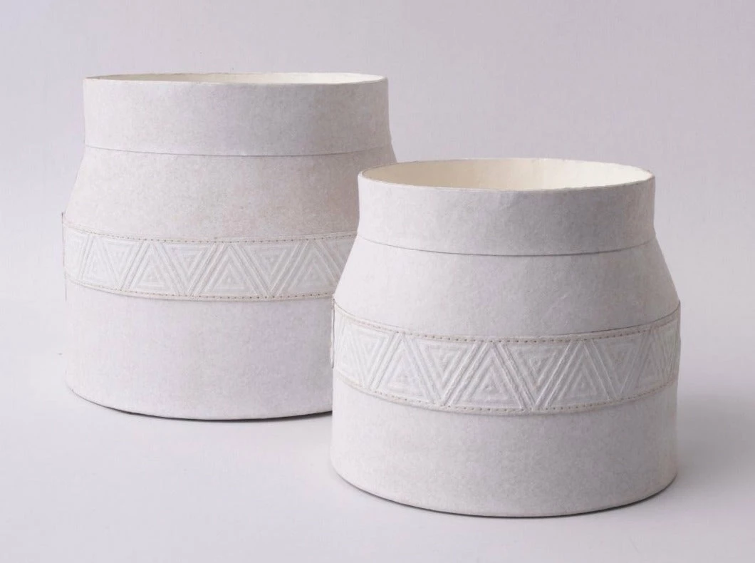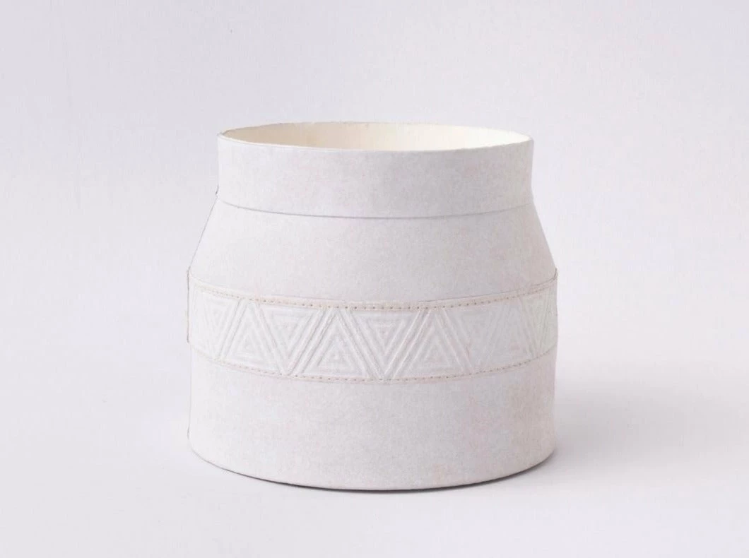 The Matki Pot with Kilima design in Chalk colour is a lightweight yet tough pot holder. If you use it to house your plants you can place a nursery pot directly inside. Each pot is handcrafted in a fair trade working environment by women artisans in Sri Lanka. In addition to looking great, these pots are sustainably made from recyclable materials with zero-waste production.